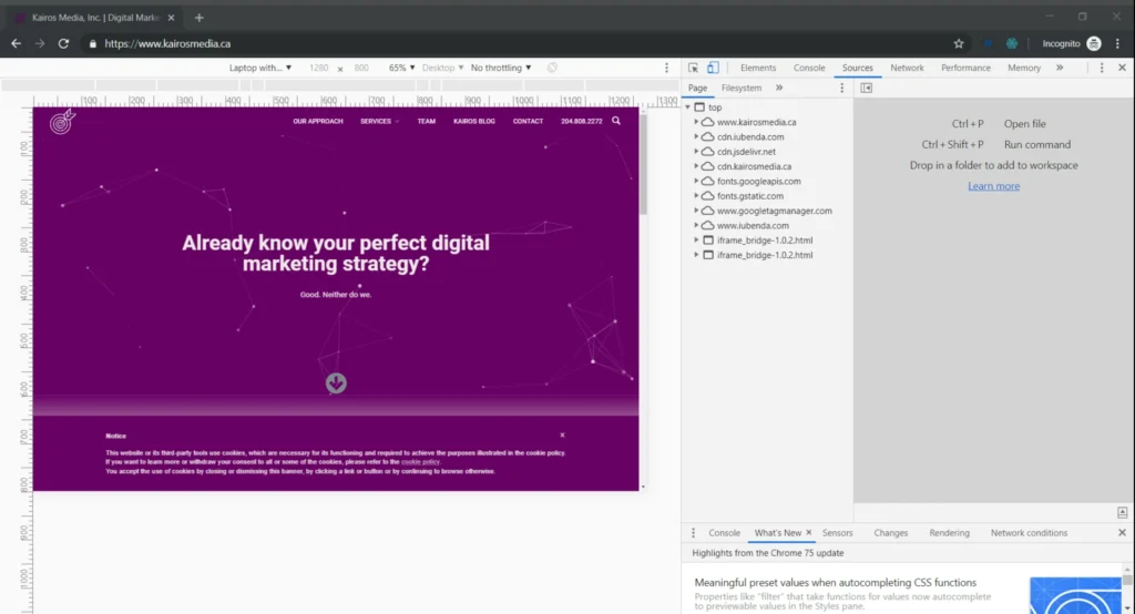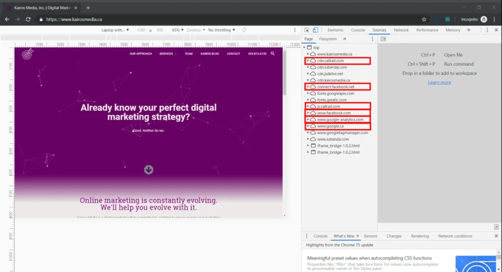 Chrome’s development tools also feature a “Sources” panel, which lists all of the resources successfully loaded by a web page, grouped by HTML frame and origin domain. As a quick visual example, here’s what the “Sources” tab looks like for Kairos Media’s homepage before a visitor consents to the use of tracking cookies: