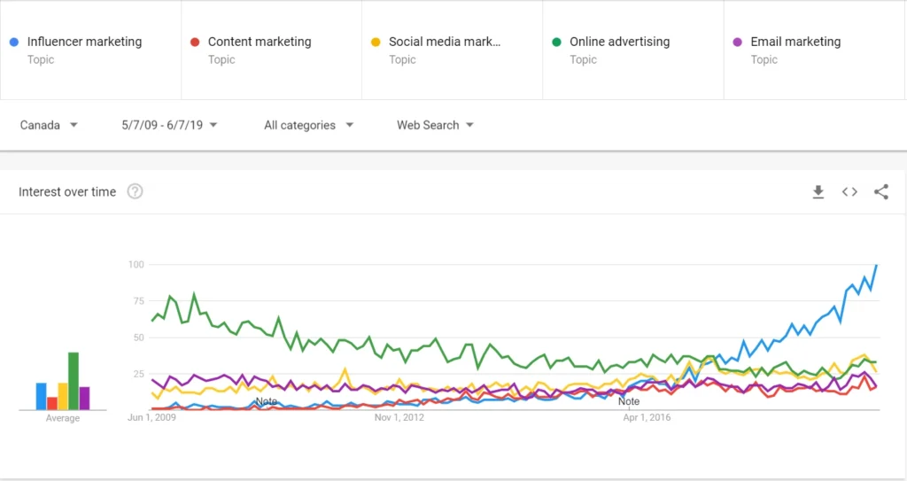 To put the recent hype around influencer marketing into context, take a look at this Google Trends graph, which compares relative monthly search interest for a few popular digital marketing topics within Canada over the past decade: