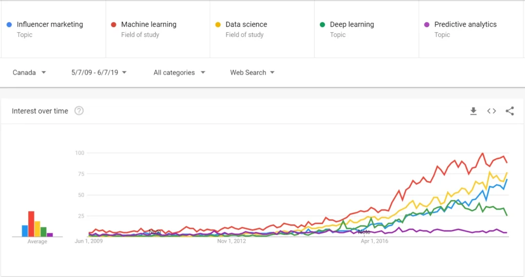 Correlation may not imply causation, but it does feel significant that the rising popularity of influencer marketing so closely mirrors our industry’s recent adoption of phrases like “data science” and “machine learning”.